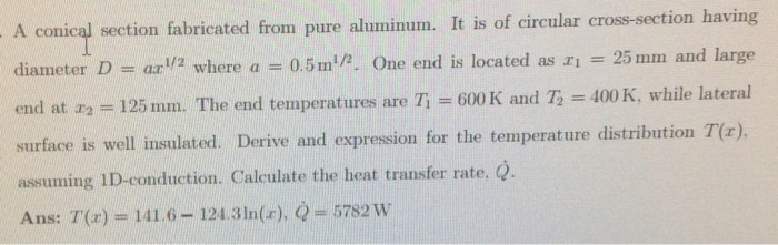 The end temperatures are t1 400 k and t2 600 k while the lateral surface is well insulated. It is of circular cross section having diameter d ax 12 where a 05 m 12. The diagram shows a conical section fabricated from pure aluminum.