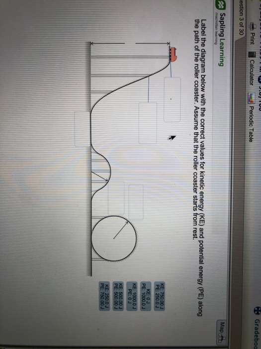So for the first position the energy is all potential energy and would therefore be pe3500j and ke0j. Label the diagram below with the correct values for kinetic energy ke and potential energy pe along the path of the roller coaster. The closer to the ground the more kinetic energy.