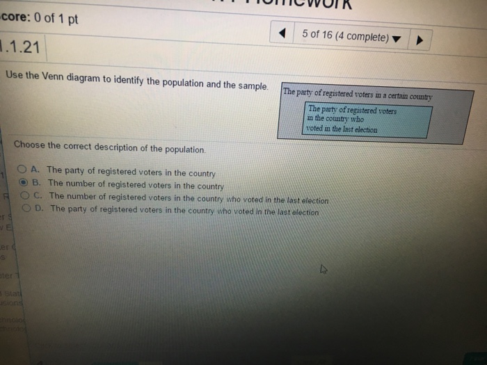 Choose the correct description of the population the party of registered voters in the country. Graphical analysis in exercises 2124 use the venn diagram to identify the population and the sample. Choose the correct.