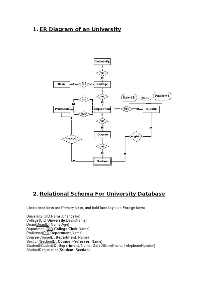 Projects have a project number a sponsor name eg nsf a starting date an ending date and a budget. Relational schema for university database underlined keys are primary keys and bold face keys are foreign keys universityuidnamechancellor collegeciduniversitydeanname deandeanid nameage departmentdidcollegechairname professorpiddepartmentname coursecouseid department name sectionsectionid course professor name student.